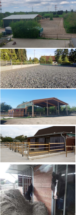 AnlageDen bis zu 12 Pferden unserer permanenten Offenstallgruppestehen 2700 m² Auslauf (davon 1500 m² befestigt) zur Verfügung. Eine 65 m² große Liegefläche sowie 3 Weidehütten bieten ausreichend Ruhemöglichkeiten. Bei der Anordnung dieser sowie der frostsicheren Selbsttränke und derüberdachten Heuraufe zur 24 h Raufutterfütterung wurde auf große Wegeund Abstände geachtet. Ein bewachsener Hügel sowie eine Bauminsel (die hoffentlich bald größer und größer werden) sorgen für Strukturierungdes Auslaufes.Insgesamt 2,5 ha Weideflächemit Baumbestand sorgen für zusätzliche Bewegungsmöglichkeit.Ein ca. 1 km langer Rundweg um die Weide kann u.a. für Schrittrunden vor und nach der Arbeit genutzt werden.Für Longen- und Bodenarbeit (und auch zum Reiten) steht eine 18 x 18 m große Longierhalle mit einem Sand-/ Holzspänegemisch der Fa. Weiland zur Verfügung.Der 21 x 42 m Reitplatzist durch den ReiTex - Boden der Firma Otto Sport International 365 Tage im Jahr bereitbar.Mittlerweile stehen 8 Paddockboxen für die Reha- und Ausbildungspferdezur Verfügung:3 Paddockboxen sind mit einer Länge von insgeamt 10 m (4m Box + 6m Paddock) sowie Breiten von 3,30 bis 4,50 m großzügig bemessen. Auch hierwird über Heuraufen 24 h Raufutter gefüttert sowie 2 x täglich das vom Besitzer gewünschte Kraftfutter. Natürlich gibt es auch hier frostsichere Tränken.In 2 weiteren Paddockboxen mit einem Paddock von 4 m x 3,60 m wird dasHeu 24 h über ein Durchfressgitter angeboten, die Boxen sind mit Softmattenausgelegt, ebenso wie bei usneren neuesten 3 Paddockboxen an unserer Longierhalle.Eine geräumige Sattelkammer sowie Futterkammer, ein überdachter Putzplatz und ein großzügiger Aufenthaltsraum runden das Angebot ab.